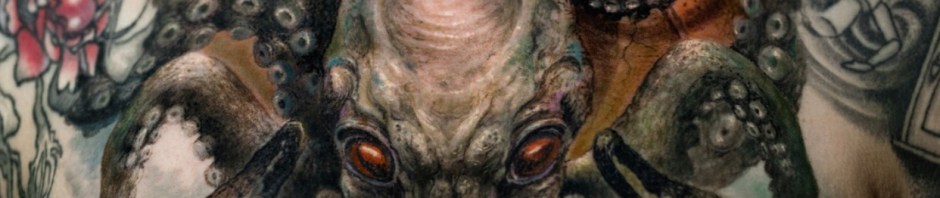 The above is from the third and final part of ‘The Call of Cthulhu’. While the first two parts we solid workaday Lovecraft, it was in this third and final part that old tentacle hugger really stepped it up a notch. It was here the world first got to ‘see’ old tentacle face himself. Demi-god, old-one, winged dragon, octopus-headed, giant, late sleeper himself. A monster from the Lovecraftian pantheon that has surpassed all the others as a counterculture phenomenon. Old tentacle face is everywhere in geek culture, from pop figures to board games, crochet patterns to role-playing games, computer games to tattoos…