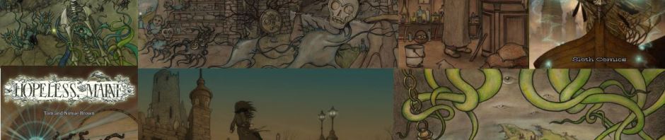 And on that heartwarming note of life, love and happiness we bid Nimue and Tom adieu for now. You can find out more about Hopeless Maine at The Hopeless Vendetta, or follow Tom and Nimue on twitter by clicking on their names, Hopeless is also on Facebook at hopelessmaine and if you’re a wise person of great taste in art and storytelling you can even buy the Hopeless Maine graphic novels published by Sloth Comics in a multiplicity of places; including Waterstones, Amazon, and if your lucky enough to attend on steampunk fairs and conventions all over the place.