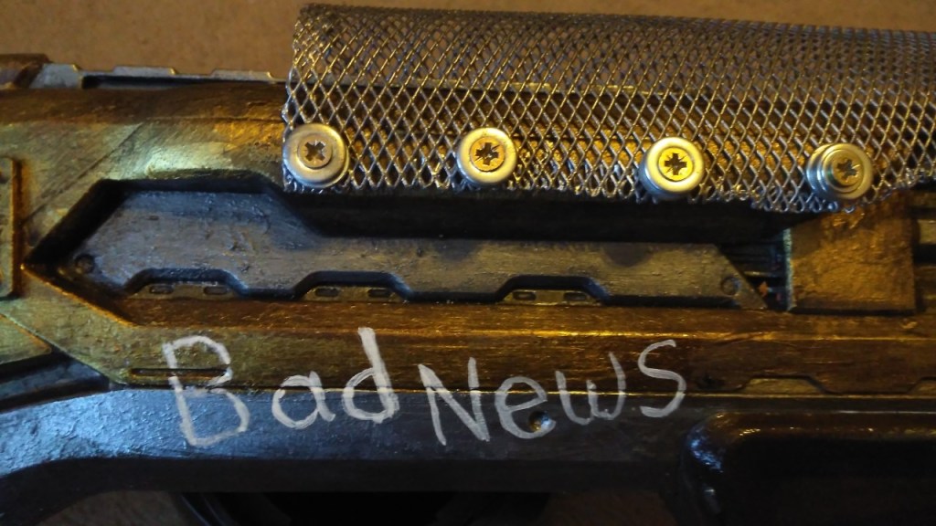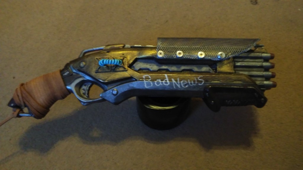 Bad News started out as a simple nerf shotgun, designed to firing its eight dart load in pairs, as you pump it in typical pump shot gun style