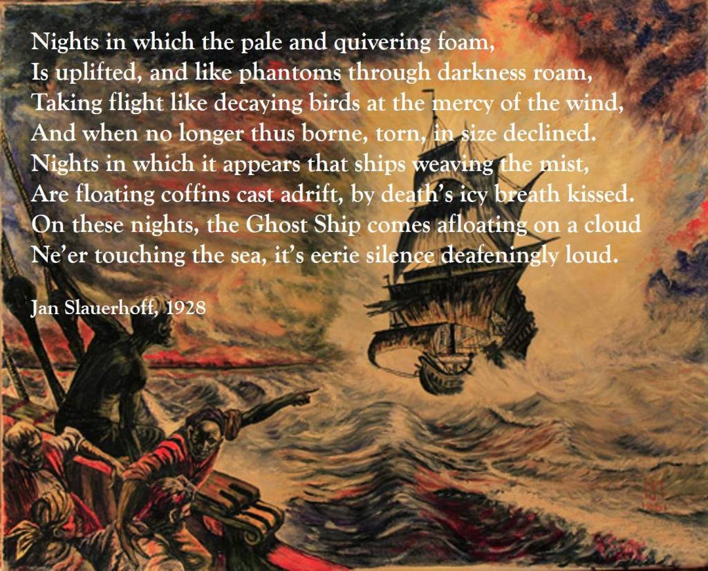 In the meantime, there were Dutch attempts to steal the story back. Piet Visser’s De Vliegende Hollander (The Flying Dutchman) was moderately successful in the Netherlands, seeing a first edition in 1901, a second in 1910, and a third in 1918. Jan Slauerhoff, possibly the most influential poet in Dutch literature and a seaman himself, added to the Dutch oeuvre in his 1928 Eldorado bundle, with no less than three poems about The Flying Dutchman (‘The Eternal Ship’, ‘The Ghost Ship’, and ‘The Flying Dutchman’).