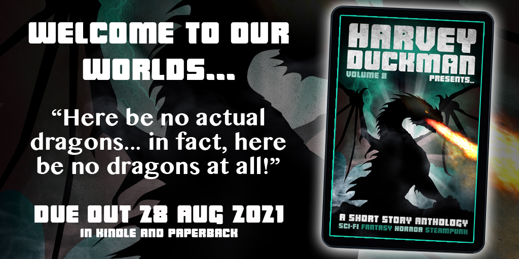 Harvey 7, which does indeed contain no actual dragons, but 15 stories I can’t wait to read from fourteen gifted writers (and me) is out this weekend. I’m sure a link or three will appear before long to lead you to our worlds. But in the mean time, if you have never picked up a copy now is a good time to start and that first small acorn Harvey Volume One is now free in eBook on all platforms. So what’s stopping you…