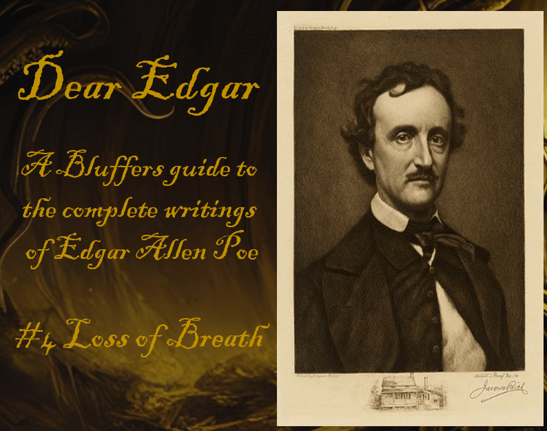 Suffice to say the medical community were not held in the highest of esteem in 1830, making them a fair target for Poe’s satire. In the case of the medical profession, it really was a different time… That however is also the essence of the issue’s I have with Dear Edgar’s ‘Loss of Breath’ It is all of its time and while that doesn’t excuse the horrendous misogyny of opening passage, it does explain all you really need to know about the rest of story. Mr Lackobreath in the midst of berating his with suddenly losses the ability to breath. He doesn’t die, he just can’t talk and doesn’t breathe. Of course at first his main issue with this strange affliction is that he can not longer berate his wife… And so he geos into hiding so she doesn’t realise what has happened to him…