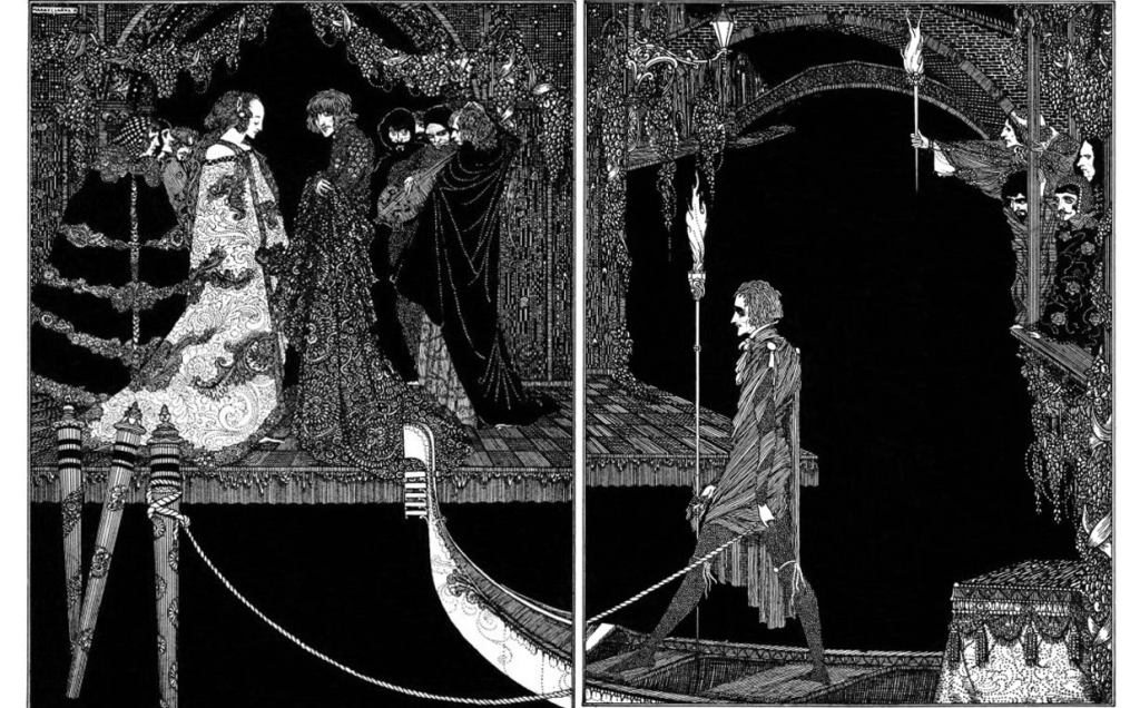 Then the stranger collapses on to a chair while the narrator answers a knocking at the door to discover a page arrived from the Ducal palace to bring new that an hour after sunrise the marchesa took her own life with poison. The narrator turns to see the stranger has joined her in this final tryst. In other words it all goes a bit Romeo and Juliette…