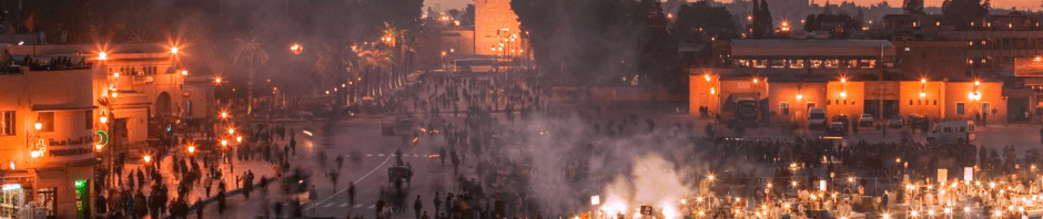 It is in nightfall that the market comes to life; it’s whole pulsing mass absorbing the surroundings as its tentacles creep out past the restaurants and cafes stretching towards Koutoubia at the southern end, where row upon row of formerly fantasia horses stand hitched to chariots awaiting tourists, marshalled by a stockman with a whispered sideline in ‘hash…women.’