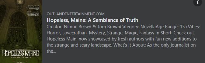 Now as it is quite possible you are aware, I am a bit of a fan boy when it comes to the work of Nimue and the esoteric creation Hopeless Maine (and Nimue’s writing in general). So when I was given the chance to read a early copy of Semblance of Truth I jumped at the chance.