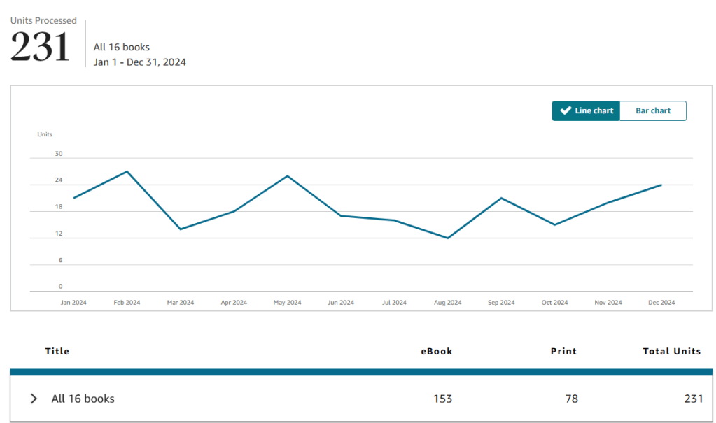Unfortunately the ebook market in general has been swamped. It was swamped before AI now everything is far worse. Amazon to there credit are trying to manage AI books away from their platform but it is a bailing bucket in a storm. Despite this however my page reads for the last year are actually up despite the lack of new releases, Jan 1 – Dec 31 in 2023 they were 64,460